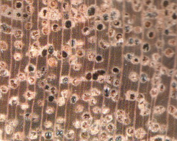 ●識(shí)別要點(diǎn):樹皮堅(jiān)硬、粗糙,常呈半卷形片狀脫落。斷面常滲有大量的樹膠。白色點(diǎn)狀的軸向樹膠道明顯,單獨(dú)或短弦列。
