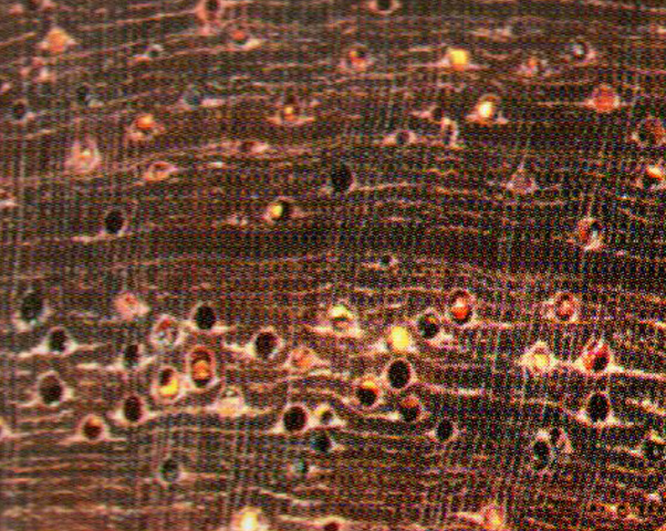 散孔材。管孔肉眼下略見,甚少至略少,大小中等;主為單管孔。少數(shù)徑列復(fù)管孔(2-3個);富含黑褐色樹膠,部分管孔內(nèi)可見金黃色的沉積物。類似檀香紫檀的金星,軸向薄壁組織放大鏡下明顯,主為不規(guī)則斷續(xù)細(xì)線狀,還有部分翼狀和環(huán)管狀。木射線放大鏡下可見,密至甚密,甚窄。波痕明顯。