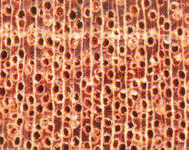 散禮材。管孔肉眼下明顯,略多,大小中等;單管孔;部分斜列;侵填體豐富,軸向蒲壁組織放大鏡下可見,環(huán)管束狀或近翼狀。本射線肉眼下略見。略密,略寬。軸向樹膠道內(nèi)眼下明顯,長(zhǎng)弦列白色點(diǎn)狀。