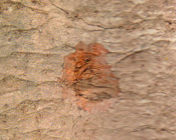 厚0.5 ~ 1.5 cm。外皮灰白至灰褐色,較薄。堅硬,易小片狀脫落而殘留淺凹坑,密布卵圓形皮孔。內皮新鮮時黃白色,久則成橘黃色。韌皮纖維略發(fā)達,石細胞發(fā)達,顆粒狀至層狀。分布均勻。